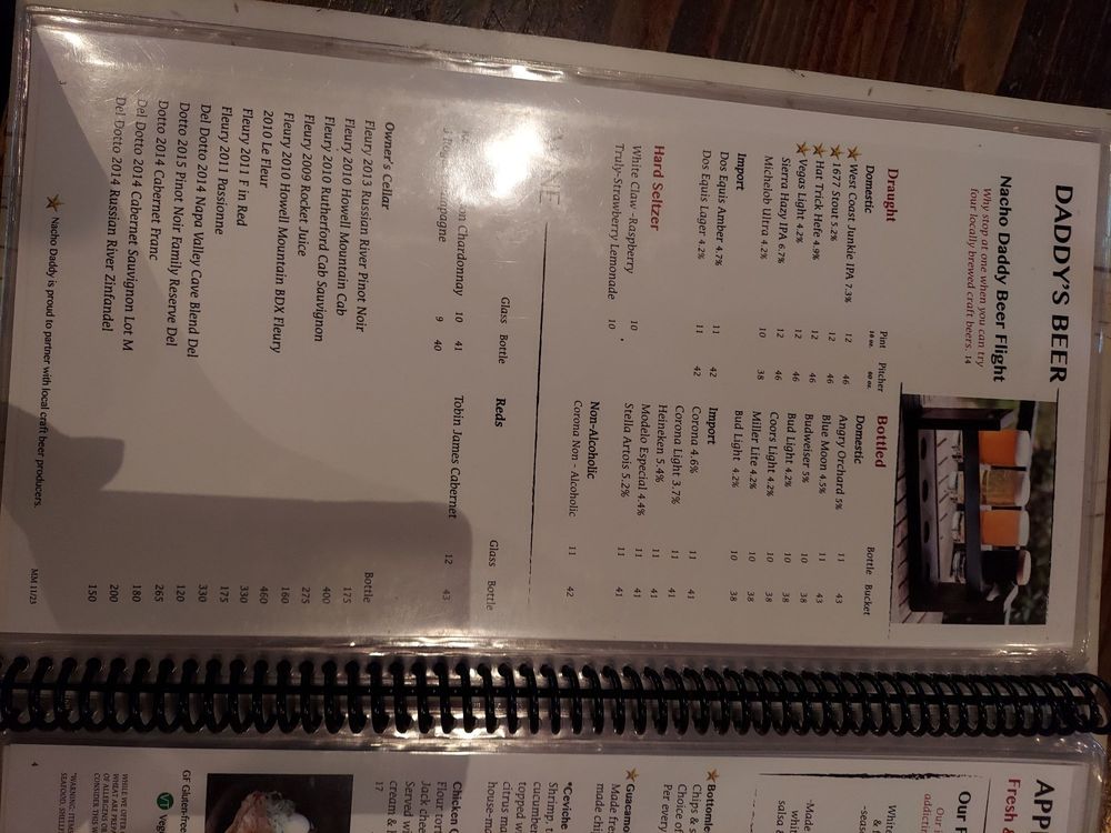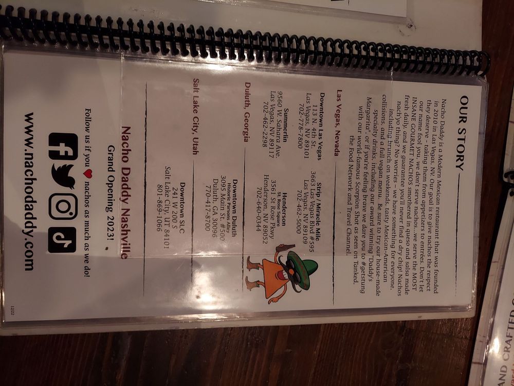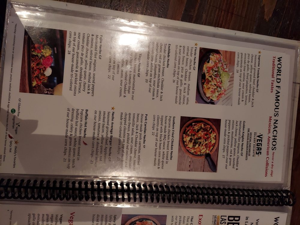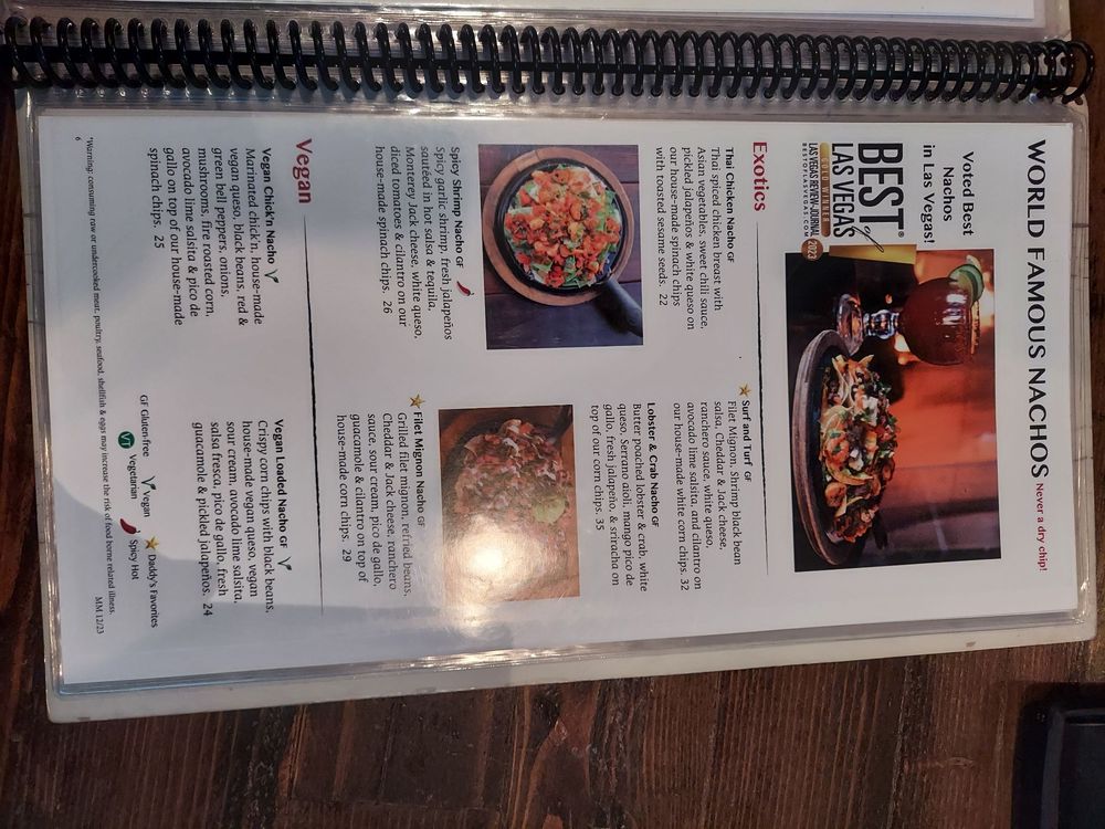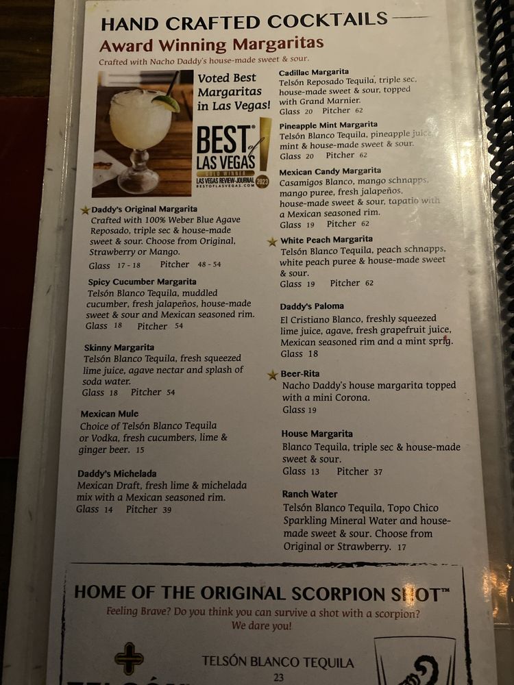Introducing the menu at Nacho Daddy, a vibrant spot on Las Vegas Boulevard, offering a mix of New American, Breakfast & Brunch, and Mexican cuisine. This trendy restaurant provides a range of options, from vegan and vegetarian dishes to classic meat choices. With a fun, lively atmosphere and excellent service, Nacho Daddy is a go-to place for groups and families. Customers rave about the Daddy Nachos, bursting with balanced flavors, and the Filet Mignon Signature Tacos, despite some feeling the extra charge for filet mignon was not justified. The Scorpion Shot, a tequila shot with a tiny scorpion, adds a unique touch to the experience. Don't miss the pitcher Margaritas, perfect for sharing and customizable with different rims. A must-visit for a memorable dining experience in Vegas.