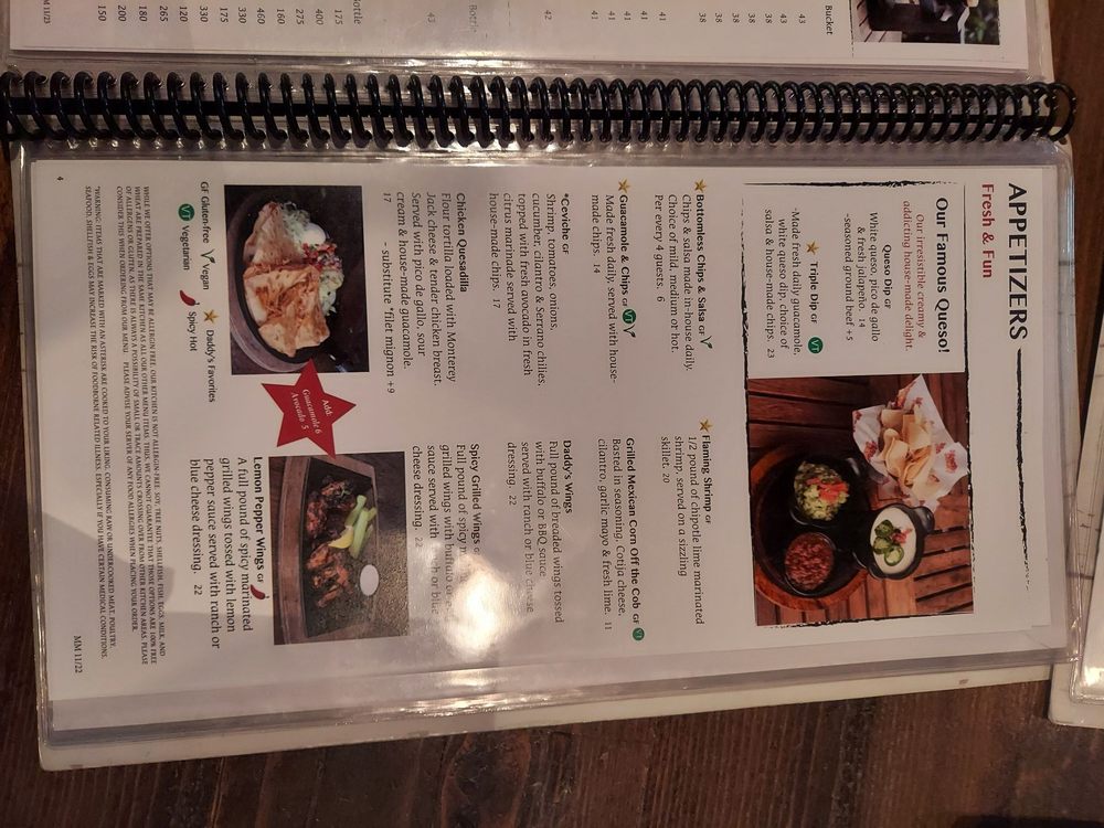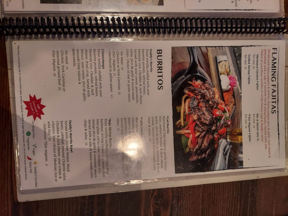 Served with fajita peppers and onions, cherry tomato pico de gallo, sour cream and guacamole with a side of Mexican rice and refried beans, flamed table side. Choice of flour or corn tortillas and Daddy's salsa.
